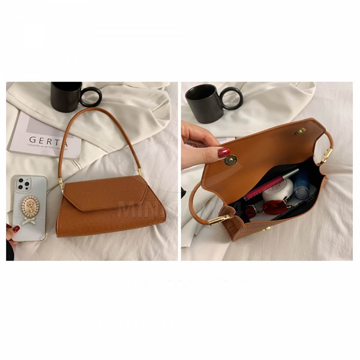 Сумка-багет женская Stella коричневая в форме трапеции – идеальный вариант для выхода на праздничные мероприятия и ежедневной носки. Сумка женская выполнена из белой экологической кожи, которая не требует особого ухода. Мягкая экокожа хорошо переносит холод и жару, не трескается в минусовую температуру, не выцветает под действием ультрафиолета и не боится дождя или снега. Сумка через плечо имеет прочный каркас, поэтому не теряет своей формы. Клапан застегивается на магнитные замки. Длина ручек не регулируется. Прочная хлопковая подкладка не разрывается из-за острых предметов. Внутри сумки-багета есть объемный отсек и небольшой кармашек на молнии для мелочей.